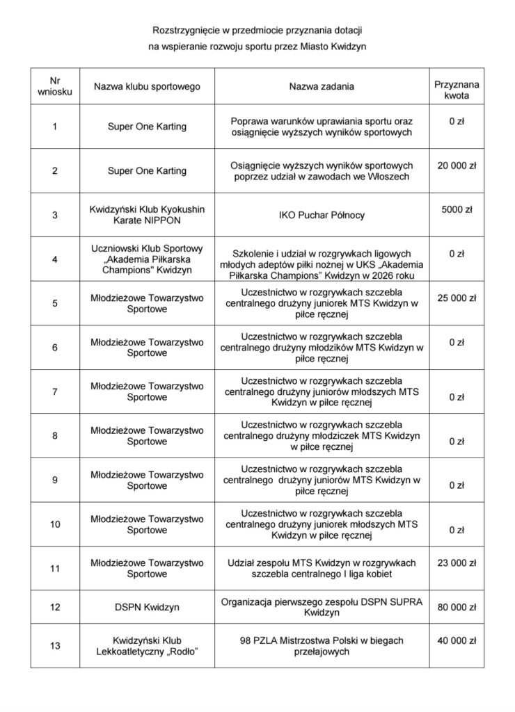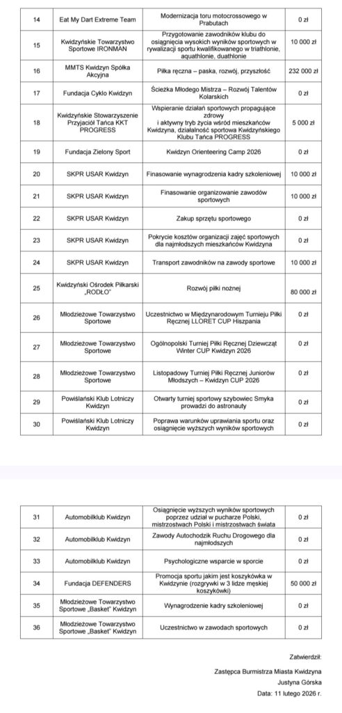 Dotacje sportowe Kwidzyn 2026 zostały rozstrzygnięte. Miasto opublikowało wykaz klubów i organizacji, które otrzymały wsparcie finansowe na realizację zadań sportowych. Poniżej przedstawiamy listę podmiotów, którym przyznano środki.